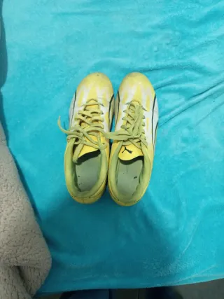 Botas de fútbol Puma de color amarillo. - Diseño con franjas negras y blancas. - Cordones amarillos. - Suela con tacos. -Talla:41=26'5 cm