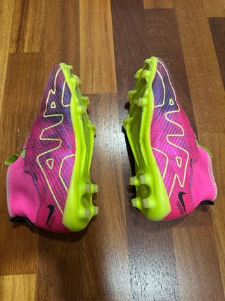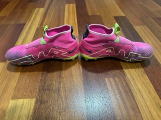 Botas de fútbol Nike Mercurial para niño en talla 35. Diseño vibrante en color rosa con detalles en verde lima y amarillo. - Cierre sin cordones para un ajuste rápido. - Suela con tacos para césped. - Logo de Nike visible.