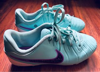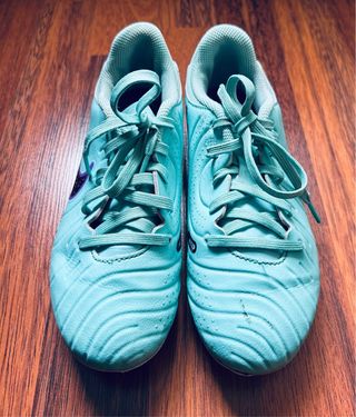 Botas de fútbol Nike Tiempo en color azul turquesa y detalles morados numero 34. Perfectas para jugar en césped artificial. Los tacos alguno está dañado como se ve en la ls ultimas fotos. Por lo demás en perfecto estado. - Talla 34. - Diseño moderno.