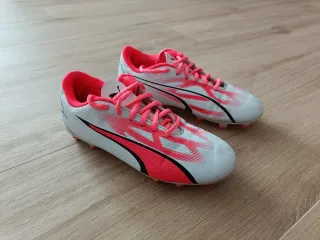 Botas de fútbol infantiles de la marca Puma, modelo Ultra Play, diseñadas para el juego en césped, tanto artificial como natural. - Color blanco con detalles en rosa neón y negro. - Cierre con cordones. - Suela con tacos para mayor agarre. - Poco utilizadas, se quedaron pequeñas en un corto intervalo de tiempo.