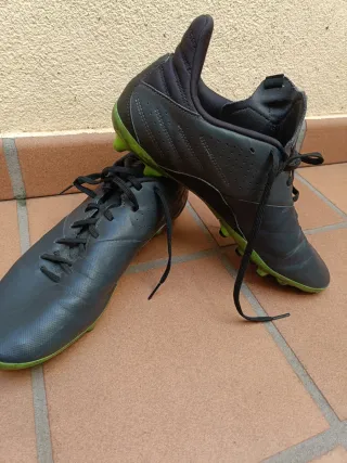 Botas de fútbol KIPSTA (Decathlon), ideales para niños o niñas que juegan al fútbol base o están empezando en entrenamientos y partidos. ⚽ Marca: Kipsta 👟 Estado: muy bueno, poco uso 🟢 Tacos de goma con buen agarre y poco desgaste. AG/FG Botas cómodas y resistentes, pensadas para el uso diario en entrenamientos, colegio, extraescolares o partidos. Ofrecen buena sujeción del pie y estabilidad para correr, frenar y golpear el balón con confianza. Diseño en negro con detalles verde flúor, moderno y fácil de combinar con cualquier equipación. Perfectas para césped artificial o campos de tierra.
