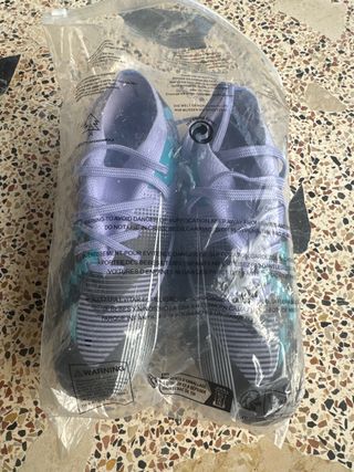 Vendo botas de fútbol taco ideales para césped artificial y tierra. Están nuevas, sin usar, aún con su bolsa original. Diseño moderno en tonos lila, verde agua y negro, muy cómodas y ligeras, con buena suela para agarre y estabilidad durante el juego. ✔️ Estado: Nuevas a estrenar ✔️ Uso: Fútbol – césped artificial / turf ✔️ Suela taco ✔️ Color: Lila / verde agua / negro ✔️ Se venden porque me van grandes Talla 38 Entrega en mano o envío.