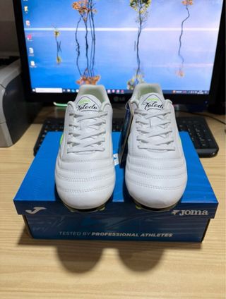 Botas de fútbol joma toledo en color blanco con detalles en verde neón. - Diseño moderno y llamativo. - Suela con tacos para césped artificial o natural. - Marca Joma. - Modelo Toledo. - Tallas Disponibles: 32, 34, 35, 36, 37, 38 y 39.