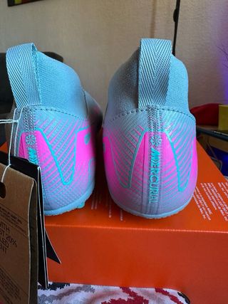 Botas de fútbol Nike para niño en talla 33. Diseñadas para ofrecer comodidad y rendimiento en el campo. - Color gris con detalles en rosa y turquesa. - Logo de Nike en el lateral. - Suela con tacos para césped.