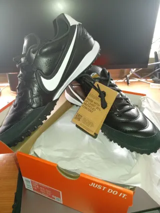 Botas de fútbol Nike Premier IV en color negro. Nuevas a estrenar. - Talla 44.5 - Fabricadas con al menos un 20% de material reciclado. - Diseño clásico con el icónico swoosh de Nike en blanco. - Suela con tacos para césped artificial o duro.
