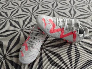 Botas de fútbol Puma en color gris con detalles en rosa. Talla 32. Están usadas, pero solo en partidos y siendo mi hijo portero no les ha dado mucho desgaste - Diseño moderno y llamativo. - Cordones blancos. - Suela con tacos.