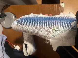 Botas de fútbol de alta gama con un diseño moderno y llamativo. - Color principal blanco con detalles en azul. - Diseño con estampado de líneas y salpicaduras. - Número 10 en el talón. - Cierre con cordones blancos. - Caña alta para mayor sujeción. -Nuevas,nunca se han usado -Precio negociable