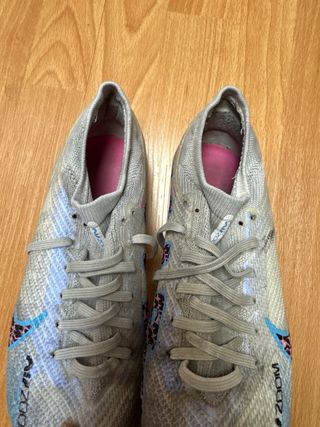 Botas de fútbol Nike Air Zoom con un diseño moderno y llamativo. - Color gris con detalles en azul y rosa. - Cierre de cordones. - Suela para césped artificial. Son las de gama alta.