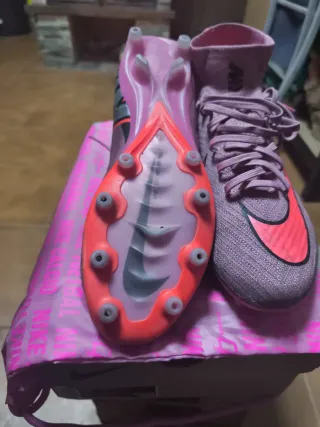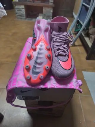 Botas de fútbol Nike de color rosa con cordones. Precio negociable - Diseño de punto. - Detalles en negro y rosa fucsia. - Incluye bolsa de tela con logo Nike. Para césped Natural