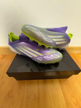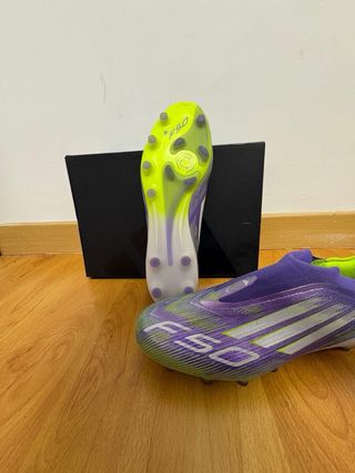 Botas de fútbol Adidas F50 de gama alta. - Diseño sin cordones. - Color morado y verde lima. - Suela con tacos para césped.