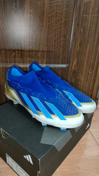 Botas de fútbol Adidas X Crazyfast Messi League FG, gama media, talla 42. Están en muy buen estado, prácticamente nuevas. Sólo se han usado una vez, prácticamente 10 minutos, el motivo de la venta es prq no son de mi talla. Incluye los cordones. - Modelo: Adidas X Crazyfast Messi League FG - Talla: 42 - Color: Azul y dorado - Tipo de suela: FG (firme suelo)