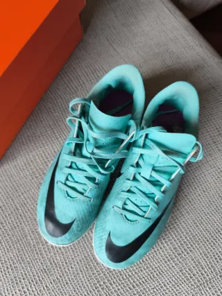 Botas de fútbol Nike en color turquesa, talla 33. Ideales para jugar en pistas interiores. - Diseño deportivo. - Cierre con cordones. - Suela de goma.