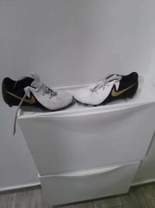 Botas de fútbol Nike para niño, talla 37'5. Diseñadas para ofrecer un buen agarre en el campo. - Color blanco y negro con detalles dorados. - Cierre con cordones. - Suela con tacos para césped. - Logo de Nike en los laterales.