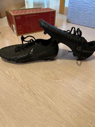 Botas de fútbol Nike Tiempo en color negro y detalles dorados. Perfectas para césped. - Talla 42.5. - Diseño clásico y elegante. - Materiales de calidad.