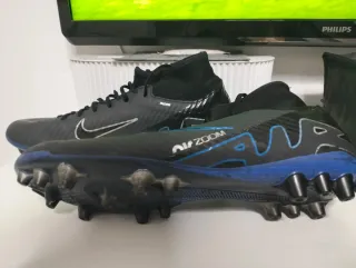 Botas de fútbol Nike Air Zoom con diseño moderno. - Color negro y azul. - Logo Nike en blanco. - Suela con tacos para césped.
