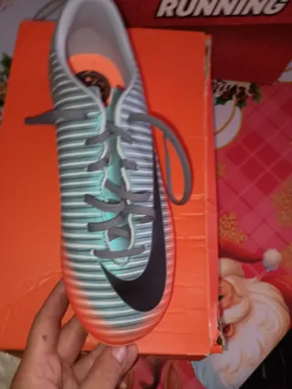Botas de fútbol Nike CR7, talla 36.5, sin estrenar. - Diseño a rayas en tonos grises, turquesa y naranja. - Cierre con cordones grises. - Logo de Nike en negro.