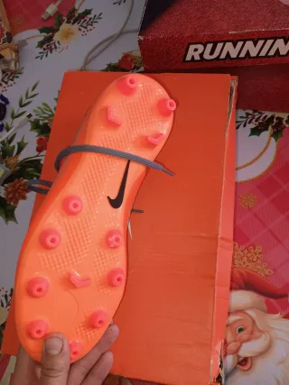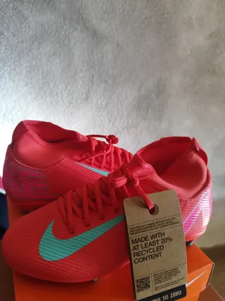 Botas de fútbol Nike Mercurial en color rosa y naranja. - Talla 38.5. - Diseño sin cordones. - Detalle de M en el lateral. - Suela con tacos para césped. Completamente nuevas , sin uso. Era un regalo pero no le valen..