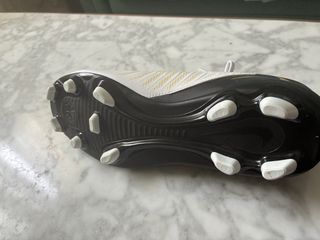 Botas de fútbol con suela de tacos. - Color blanco y negro. - Diseño con detalles dorados.