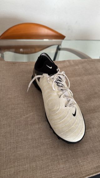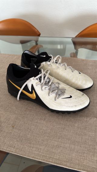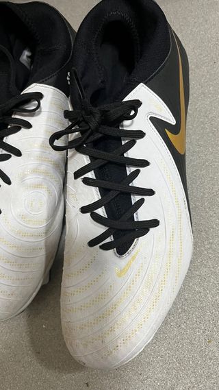 Botas de fútbol Nike Phantom. - Diseño en blanco y negro con detalles dorados. - Cierre con cordones negros. - Suela con tacos para césped artificial. Usadas un entreno n’ 43