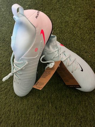Botas de fútbol Nike Phantom en color rosa y blanco. Ideales para jugar en césped artificial o natural. -Talla 42 - Diseño moderno y llamativo. - Cierre con cordones. - Suela con tacos para un buen agarre.