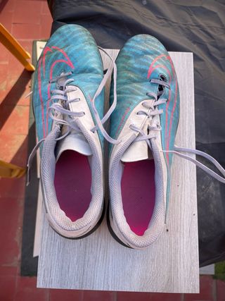 Botas de fútbol Nike Phantom con lengüeta. - Diseño multitacos. - Color azul con detalles en rosa. - Costaron 60 en sprinter - Una lengueta esta suelta