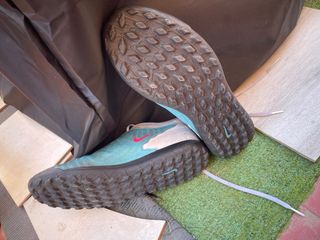 Botas de fútbol Nike Phantom GX para niño en talla 37.5. Modelo unisex. - Diseño en color verde azulado. - Detalle de swoosh en color rosa vibrante. - Suela con tacos para césped. Se han usado en 3/4 entrenamientos por una niña de pie fino y poco peso. Están súper nuevas excepto alguna mancha del roce. Entrego en Alcobendas o envío.