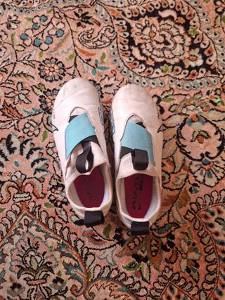 • Material ligero • Con tracción incomparable • Tiene una estructura de rejilla 3D para mejorar el toque de la pelota. • Un cierre de encaje plano • Diseño adherente con tracción multidireccional Se han usado solo 3 veces. Talla 38,5 Material de la suela: Caucho sintético Material exterior: Poliéster Material interno: Sintético pvp 115€