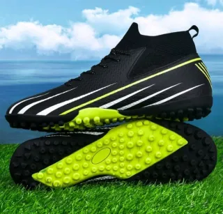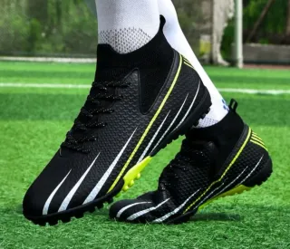 Botas de fútbol con un diseño moderno y llamativo. - Parte superior en color negro con detalles en amarillo. - Suela con tacos para césped artificial. - Diseño tipo calcetín para un ajuste cómodo.