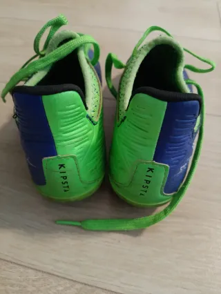 Botas de fútbol marca Kipsta en color negro y verde lima. Perfectas para jugar en césped artificial o natural. - Talla 38. - Cierre con cordones. - Diseño deportivo. Son nuevas, se hizo un esguince antes del inicio de la actividad y ni las uso, solo están probadas.