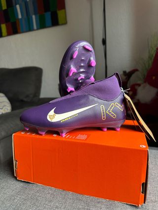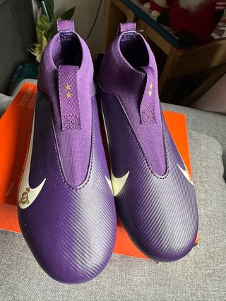 Botas de fútbol para niño de la marca Nike, modelo Mbappe. - Color morado. - Talla 33. - Diseño de caña alta. - Suela con tacos para césped artificial o natural.
