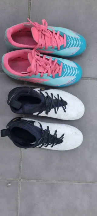 Se venden botas de fútbol para niño, ideales para entrenamientos y partidos. - Botas de color azul y rosa con cordones. - Botas de color blanco y negro con cordones.