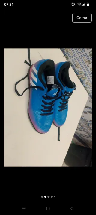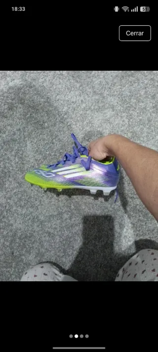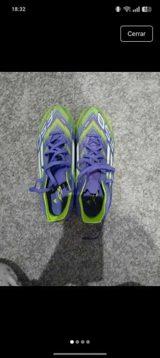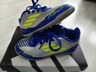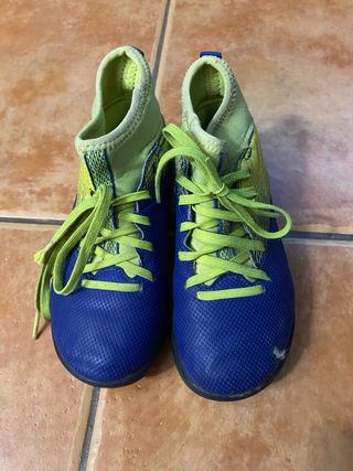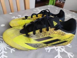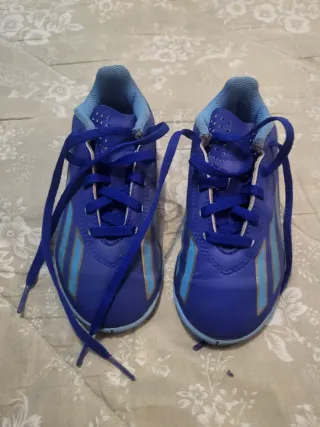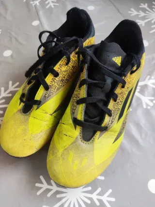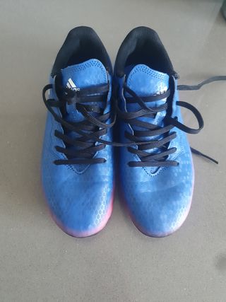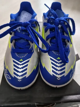 Botas de fútbol para niño de la marca Adidas, modelo F50 Messi. - Color azul y plateado. - Detalles en color verde lima. - Cierre con cordones. Son del número 28, costaron 54.99€ y no se han usado casi nada, se le quedaron pequeñas. Negociable.