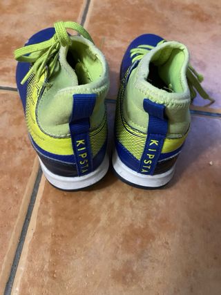 Botas de fútbol para niños y niñas, ideales para entrenar y jugar. - Color azul y verde lima. - Cierre con cordones. - Diseño de media caña. Talla 30