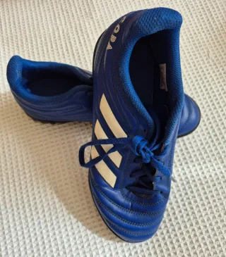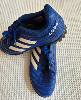 Botas de fútbol Adidas Copa en color azul, multitaco niñ@s. - Diseño deportivo. - Tiras Adidas blancas. - Cierre con cordones. - Núm. 37.5. En muy buen estsdo, casi nuevas.