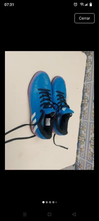 Botas de fútbol Adidas para niño en talla 35. Diseñadas para ofrecer comodidad y rendimiento en el campo. - Color azul vibrante con detalles degradados. - Cierre con cordones negros. - Logo de Adidas en los laterales y la lengüeta.