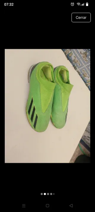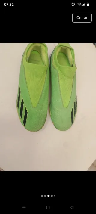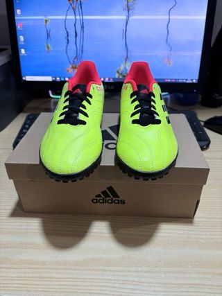 Botas de fútbol Adidas para niño en talla 36. Diseñadas para ofrecer comodidad y rendimiento en el campo. - Color verde lima con detalles en negro. - Diseño sin cordones. - Suela apta para césped artificial.