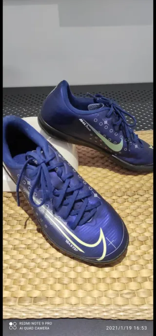 Botas de fútbol sala Nike Mercurial Vapor 13 para niño número 33,5. Diseñadas para ofrecer un gran rendimiento en campos de interior. - Color azul marino. - Detalle de círculos blancos y Swoosh verde azulado. - Número 001 en la parte lateral. - Inscripción 10A 73P en la puntera.