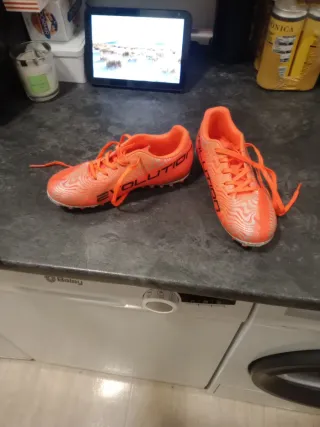 Botas de fútbol con un diseño llamativo en naranja y negro. - Cierre con cordones. - Multitaco - Suela para césped artificial o duro. Talla 28