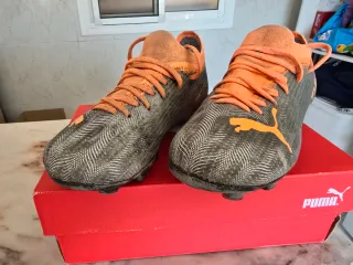 Botas de fútbol para niño con un diseño moderno y llamativo. Talla 29. - Color blanco con detalles en rojo y negro. - Cierre con cordones. - Suela con tacos para césped. - Marca Puma.