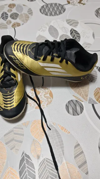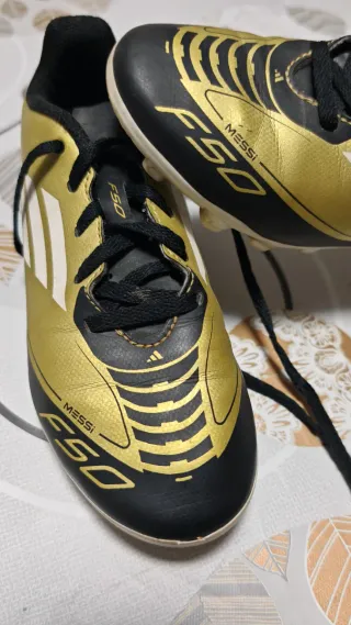 Botas de fútbol Adidas Leo Messi para niño en talla 34. Color dorado. - Diseño inspirado en Leo Messi. - Cierre con cordones.