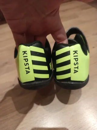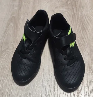 Botas de fútbol multitaco para niño en color negro con detalles en verde lima. - Cierre de velcro. - Diseño deportivo. - Suela para césped artificial. Se han utilizado una vez, al niño le hacían daño, están nuevas.