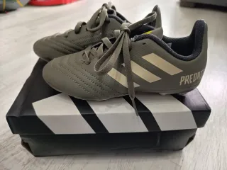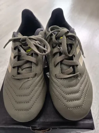 Botas de fútbol para niño de la marca Adidas, modelo Predator. Diseñadas para ofrecer un buen agarre en el campo. - Color verde militar. - Tiras laterales de Adidas en color crema. - Detalle Predator en el lateral. Número 29. Muy poco uso, se quedaron pequeñas. Negociable.