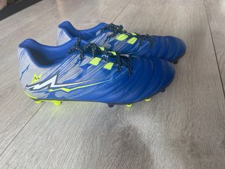 Botas de fútbol para niño en talla 35. Diseñadas para ofrecer comodidad y rendimiento en el campo. - Color azul claro con detalles en verde neón. - Cierre de cordones. - Suela con tacos para césped. - Diseño moderno y deportivo.