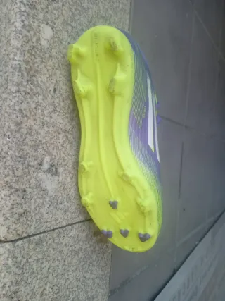 Botas de fútbol para niño en talla 34. Diseño llamativo en morado y verde con detalles blancos. - Cierre con cordones. - Suela con tacos para césped. - Marca: Adidas
