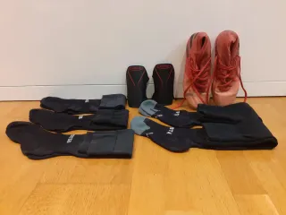 Pack de equipación de fútbol para niño. Incluye: espinilleras kispta, 2 medias kipsta y 3 medias joma (talla 35-38 pero son mas bien pequeñas). Las botas son adidas nemesis talla 38-39.