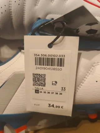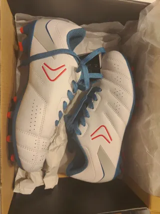 Botas de fútbol para niño en talla 33. Diseñadas para ofrecer comodidad y buen agarre en el campo. - Exterior blanco con detalles en azul y rojo. - Suela con tacos para césped. - Cierre con cordones.