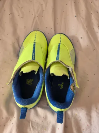 Botas de fútbol para niño en talla 34. Han tenido muy poco uso. - Color gris con detalles en verde lima. - Cierre de velcro. - Suela de goma. - El único "pero" es que están marcadas con el nombre como se ve en las fotos. *Solo hago envíos. Gracias.
