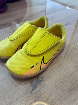 Botas de fútbol para niño marca Nike, talla 28. - Diseño deportivo en color amarillo. - Cierre de velcro para un ajuste fácil. - Detalle de la línea Mercurial.
