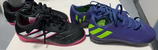 Botas de fútbol multitaco para niño de la marca Adidas. Talla 28 10 eur cada par de botas - Color morado con detalles en verde lima. - Cierre con cordones. - Suela de goma con tacos para césped artificial.