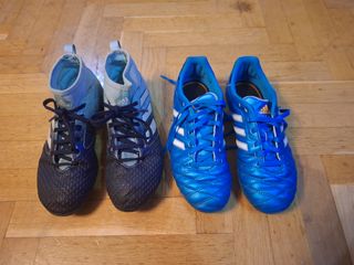 Botas de fútbol - azules y blancas talla 35( 12 euros) - negras y azules con calcetín 35 1/2 (12 euros) Con uso pero en buen estado, los tacos con poco desgaste - Diseño con cordones.